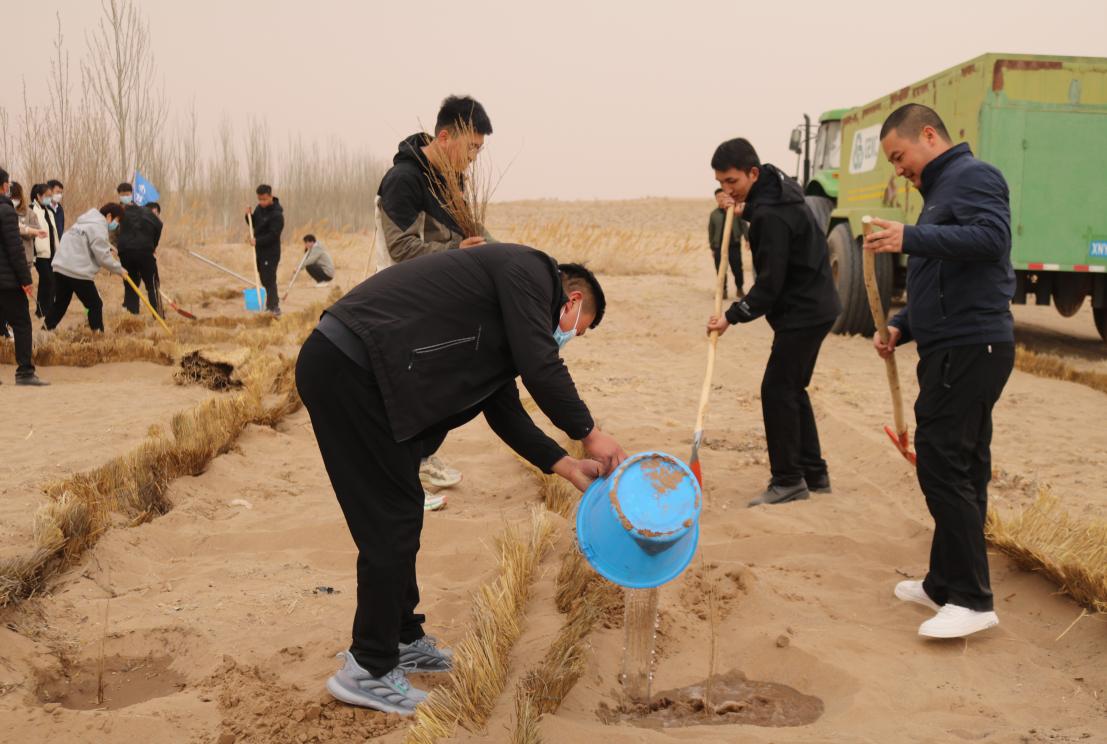 隨后,團建成員實地觀看了固沙車機械化鋪設草方格的演示,并由教練帶領全體團建成員進行“麥草方格”鋪設以及梭梭種植體驗活動,大家切身體會到了治沙工作的艱辛及沙漠地區(qū)開展綜合生態(tài)治理的重大意義。同時也體驗到機械化治沙對標準化、高效化治沙及解放勞動力的重要意義。